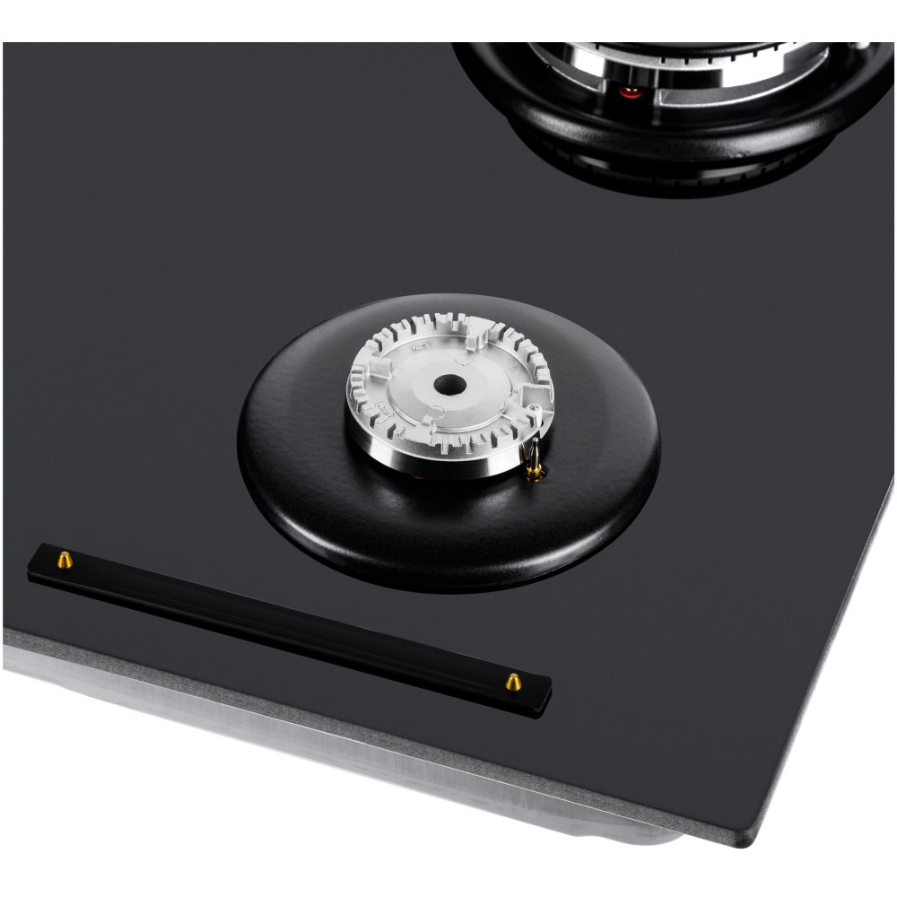 Панель выполнена из закаленного стекла черного цвета. В данной модели установлены высококачественные итальянские горелки SABAF. Три стандартные конфорки мощностью 1700 Вт, 1700 Вт, 1000 Вт и одна WOK-конфорка с двойным пламенем мощностью 3800 Вт.