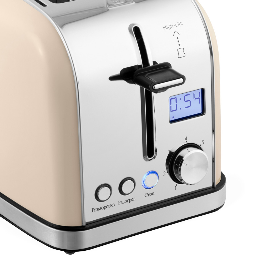 При приготовлении тостов с помощью регулятора выбираете одну из 7 возможных степеней обжарки, благодаря этому вы можете делать тосты из разных сортов хлеба (белого, зернового, черного и т.д.). Степень обжаривания отображается черточками на экране. Также на дисплее показывается обратный отсчет времени приготовления.