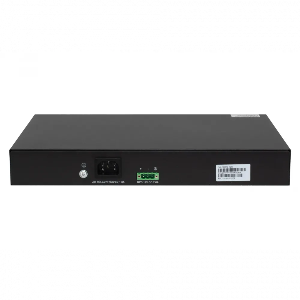SNR-S2995G-12FX имеет встроенный блок питания 90-264V AC, а также разъем RPS для подключения источника питания 12V DC. Заряд АКБ напрямую от коммутатора не производится. Такое резервирование питания обеспечивает бесперебойную передачу трафика при отключении электроэнергии.