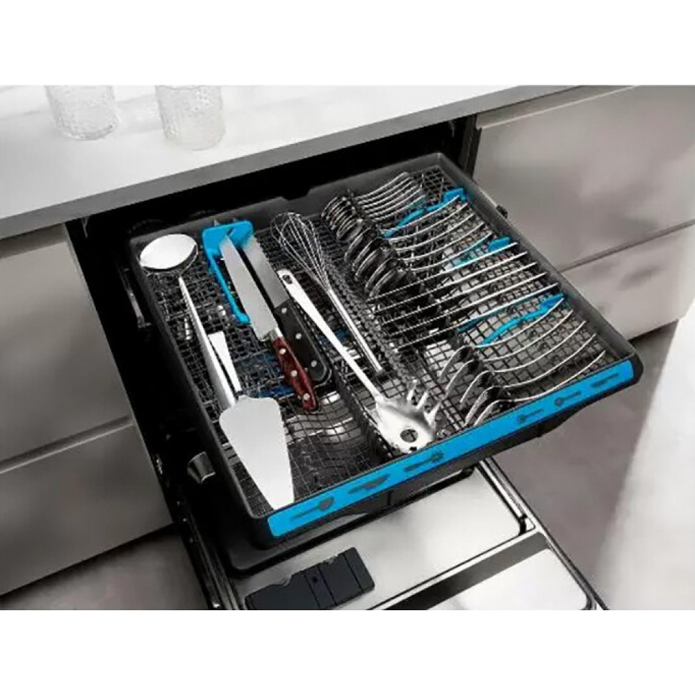 Двойной вращающийся распылитель, способный постоянно менять угол распыления, обеспечивает тщательное мытьё даже крупных предметов. Ящик MaxiFlex рассчитан на столовые приборы и кухонную утварь практически любых форм и размеров. Настраиваемые разделители и глубокий ящик облегчают хранение крупных кухонных принадлежностей необычной формы.