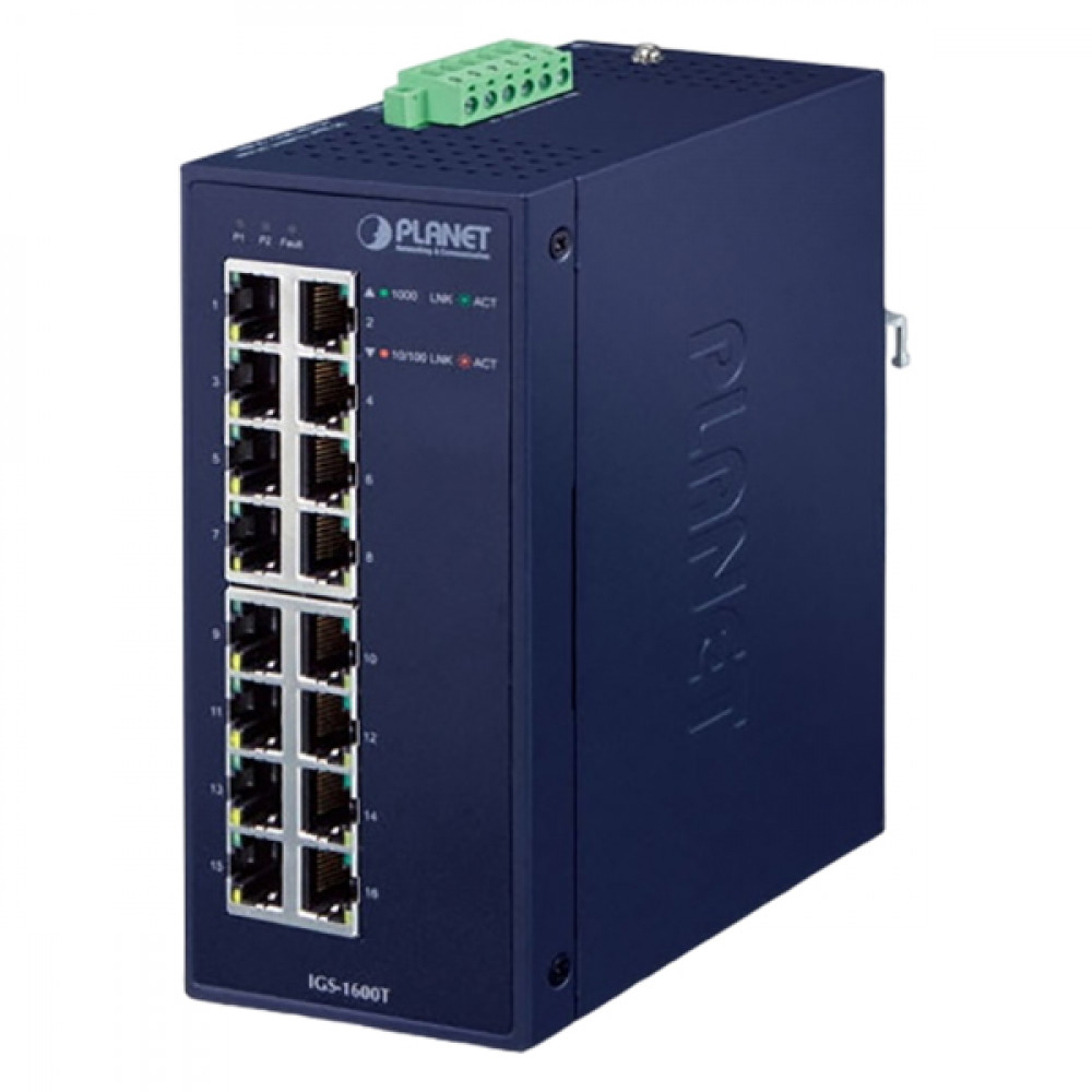 PLANET IGS-1600T Промышленный 16-портовый 10/100/1000T Gigabit Ethernet коммутатор высокой плотности оснащен прочным металлическим корпусом IP30 для стабильной работы в тяжелых промышленных условиях. Таким образом, IGS-1600T обеспечивает высокий уровень невосприимчивости к электромагнитным помехам и сильным скачкам напряжения, которые обычно встречаются на заводских этажах или в шкафах управления дорожным движением. IGS-1600T имеет встроенный источник питания с широким диапазоном напряжений (от 12 до 48 В постоянного тока или 24 В переменного тока) для приложений с высокой доступностью по всему миру, требующих двойного или резервного ввода питания. Способный работать в широком диапазоне температур от -40 до 75 градусов С, IGS-1600T может быть размещен практически в любых сложных условиях. IGS-1600T также допускает монтаж на DIN-рейку или на стену для эффективного использования пространства в шкафу.