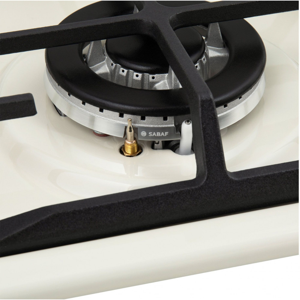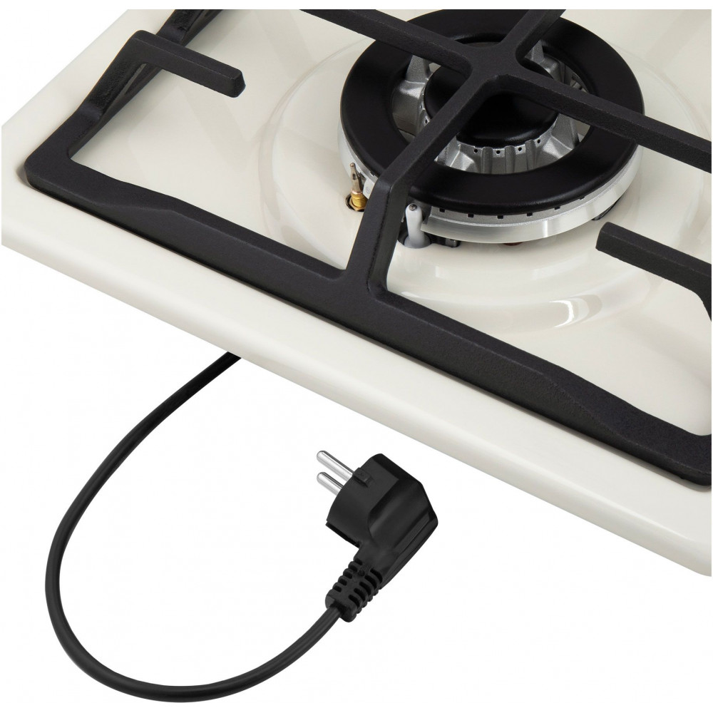 Панель выполнена из нержавеющей стали с эмалевым покрытием бежевого цвета. В данной модели установлены высококачественные итальянские горелки «Sabaf». Одна стандартная конфорка мощностью 1700 Вт и одна WOK-конфорка двойным пламенем мощностью 3000 Вт.
