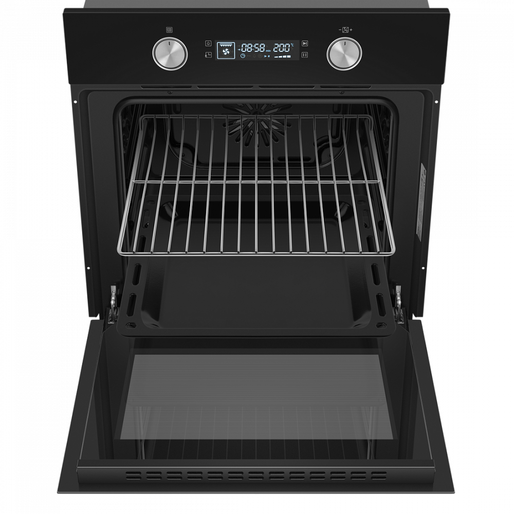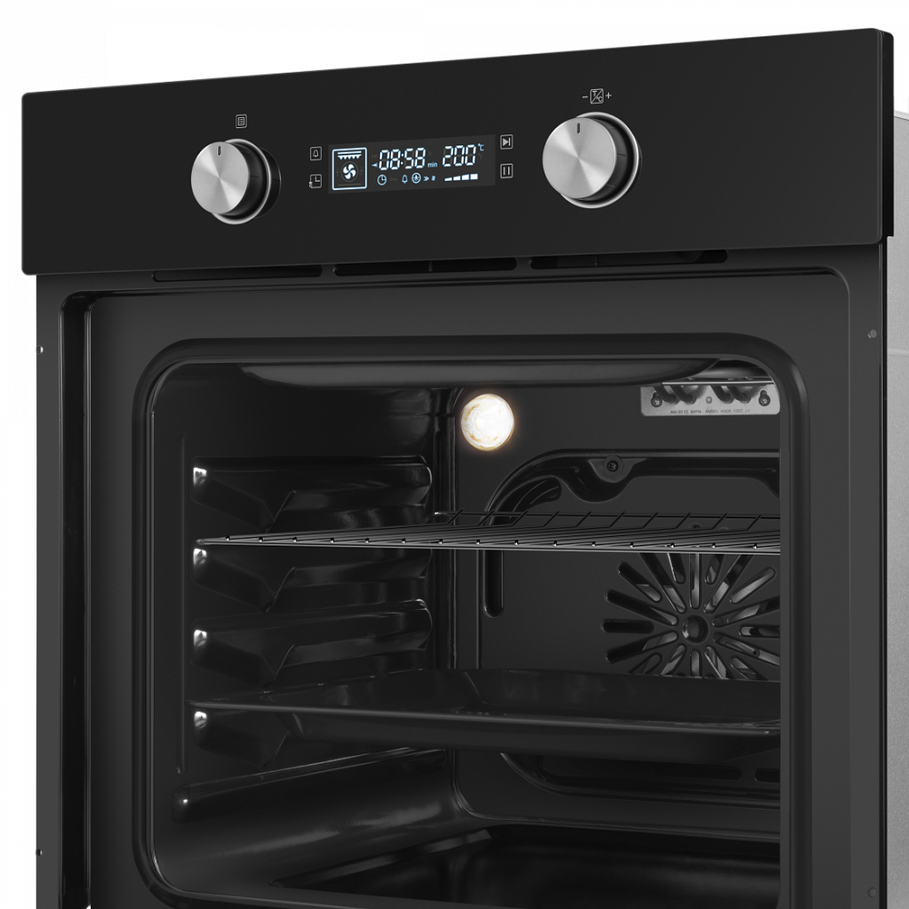 Большой объём 60 л. При таком объёме вы можете готовить одновременно несколько блюд, разместив решетку или противень на одном из 5 уровней боковых направляющих.